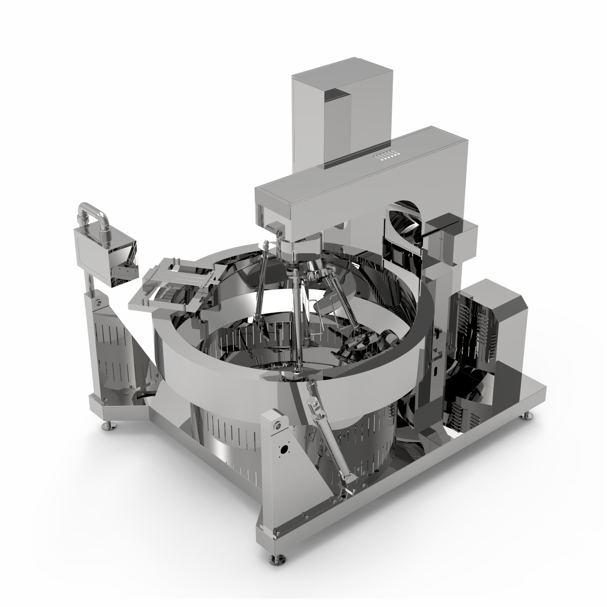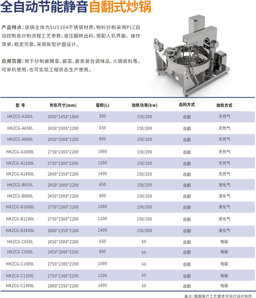 該鍋主體為SUS304不銹鋼材質(zhì),物料炒制采?PLC?動(dòng)控制各炒制流程?藝參數(shù),液壓翻轉(zhuǎn)出料,搭配?機(jī)界?, 操作簡(jiǎn)單,穩(wěn)定可靠,采?新型爐盤(pán)設(shè)計(jì)。